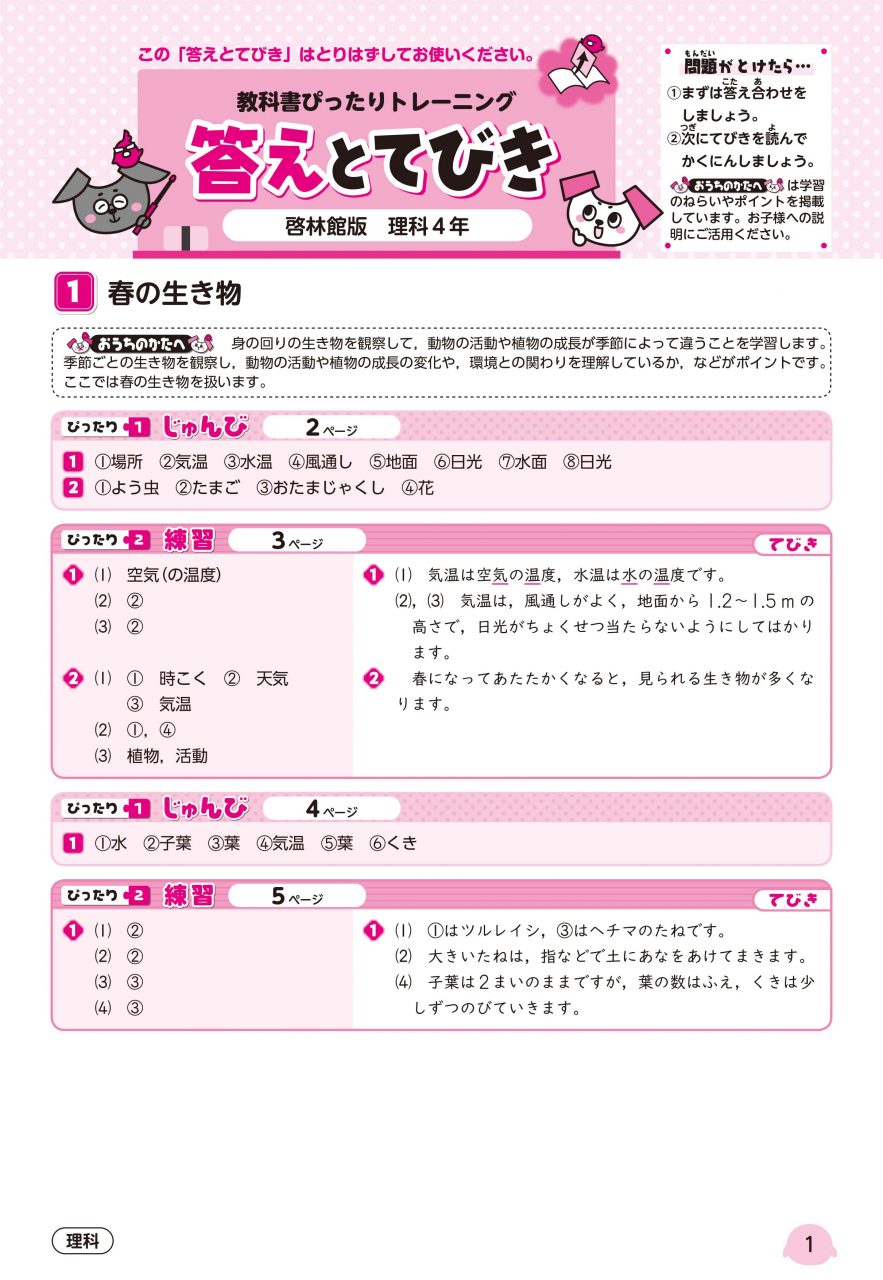 新興出版社 × ちびむすドリル コラボ企画 かわいいキャラクターと一緒に楽しく学ぶことができる「ドリルの王様」のラインアップから、特別に一部を無料公開しています。 こちらのコーナーでは、小学4年生向け練習問題プリントを公開。4年 季節と生物 1年間の観察を通して、四季による植物の変化を知ることがで きる。一年草では、春に植えた種や苗と秋にできる種とのつな がりについての言葉を拾い、子どもに推測させる。結論を出す学 年 3~6年 対応教科書 東 大日 啓 出 学 判 型 a3変形 ページ数 - 定 価 (税込) a 300円 ag 3円 b 290円 bg 310円